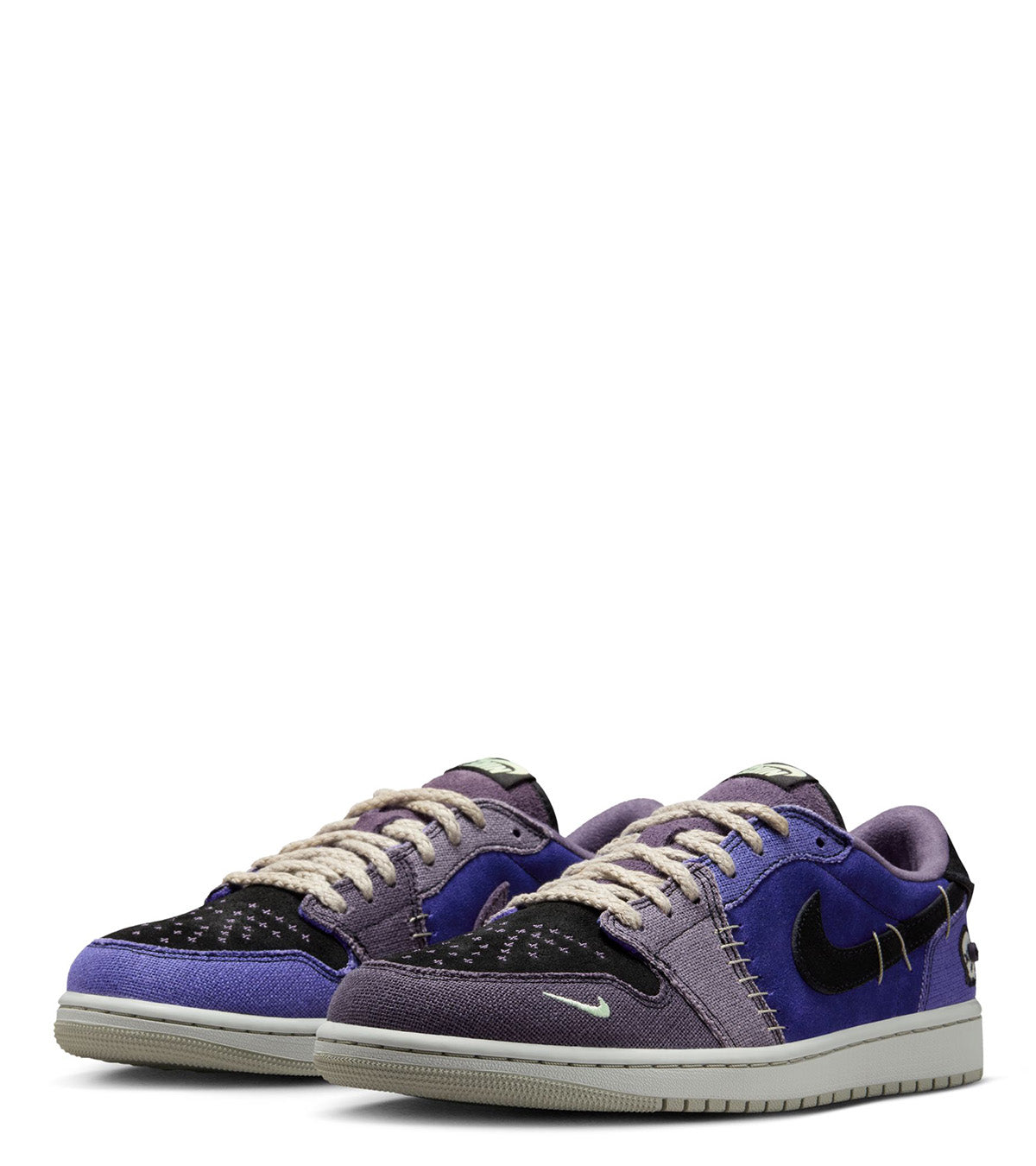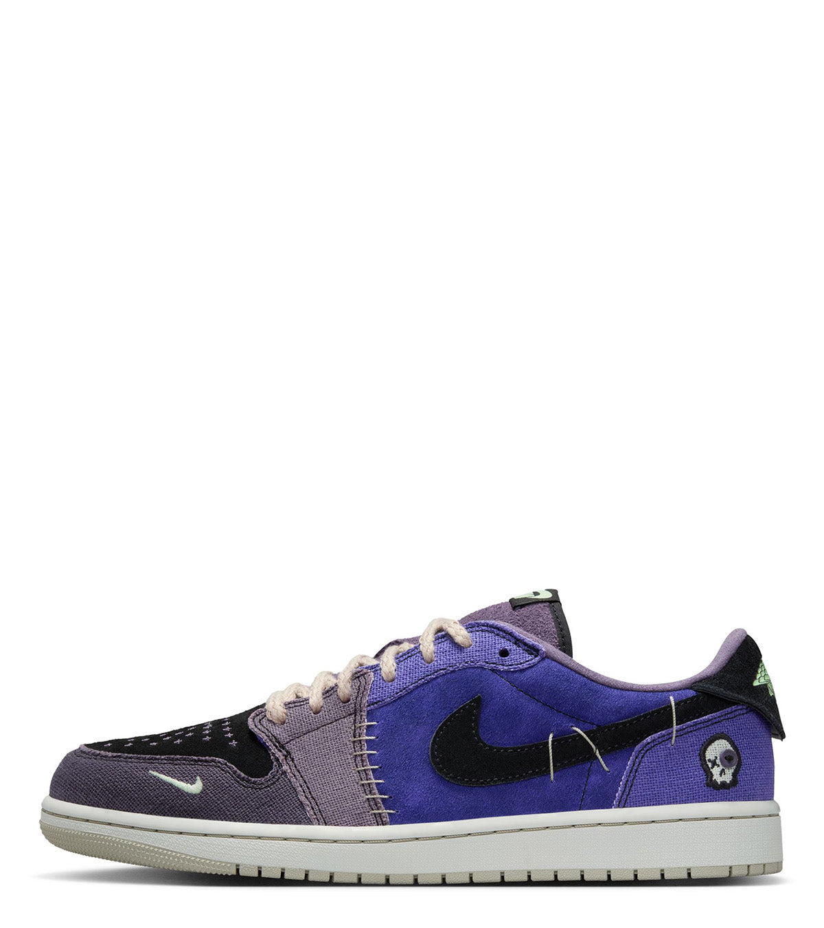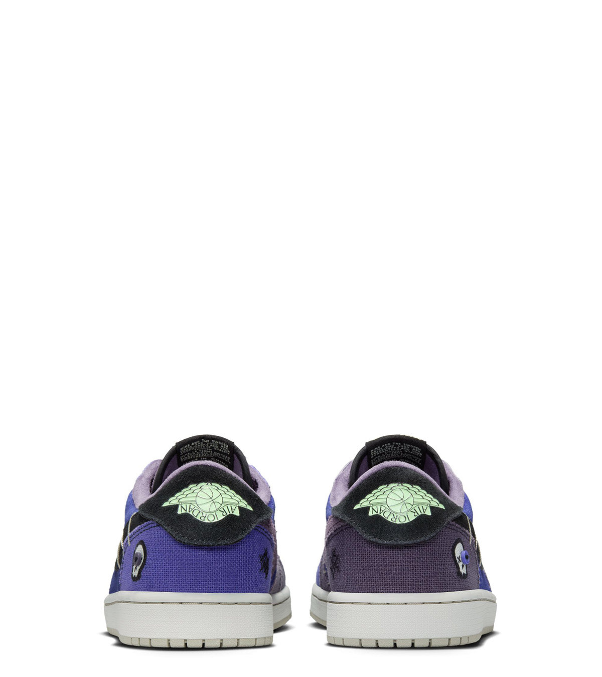 Perfect for the halloween season. This special pair of the Jordan 1 Low features a spooky black/purple overlay all throughout and features small halloween themed motifs of a skull on the back heel, cob webs on the Nike swoosh, and a glow in the dark back tab on the heel.