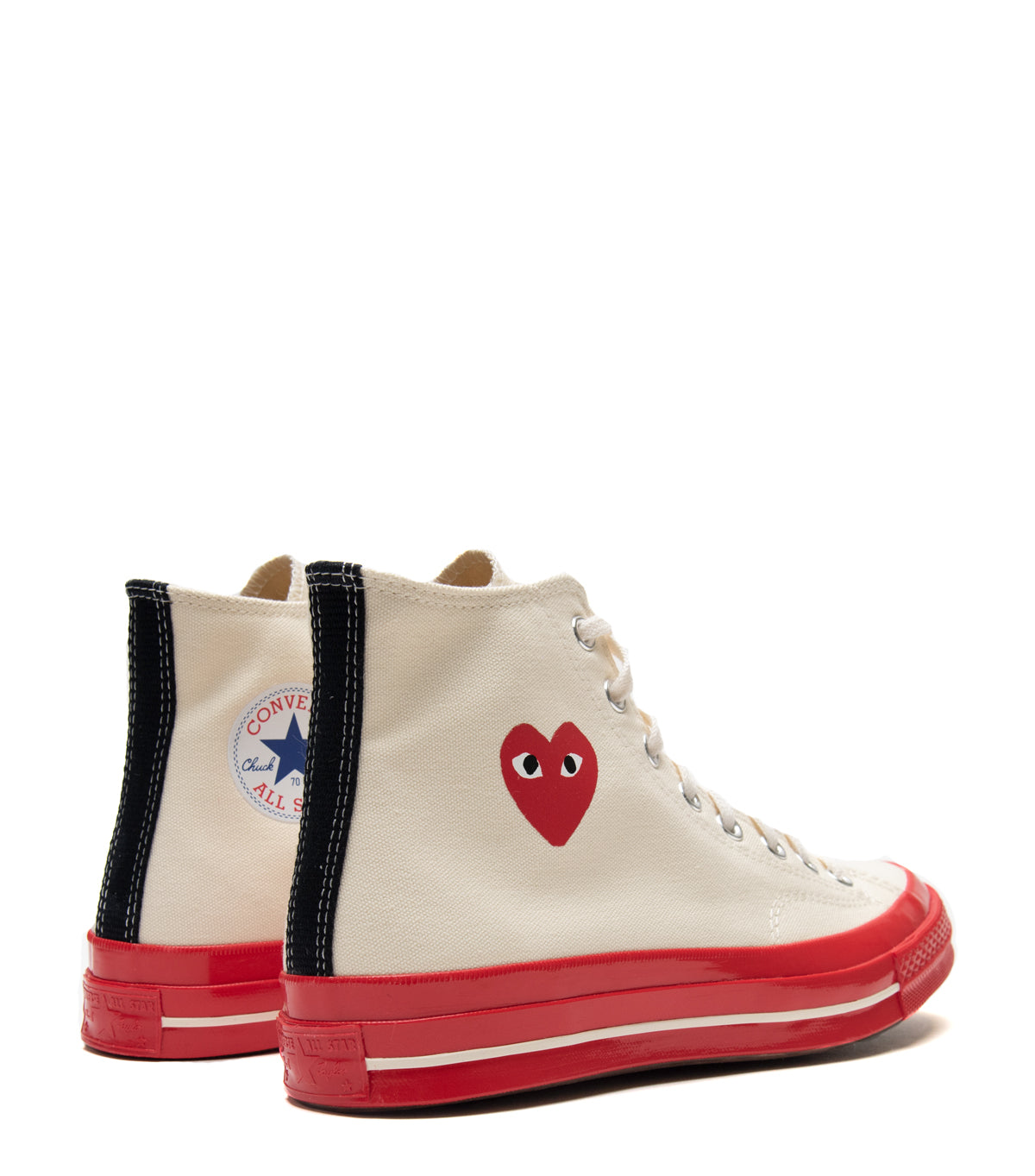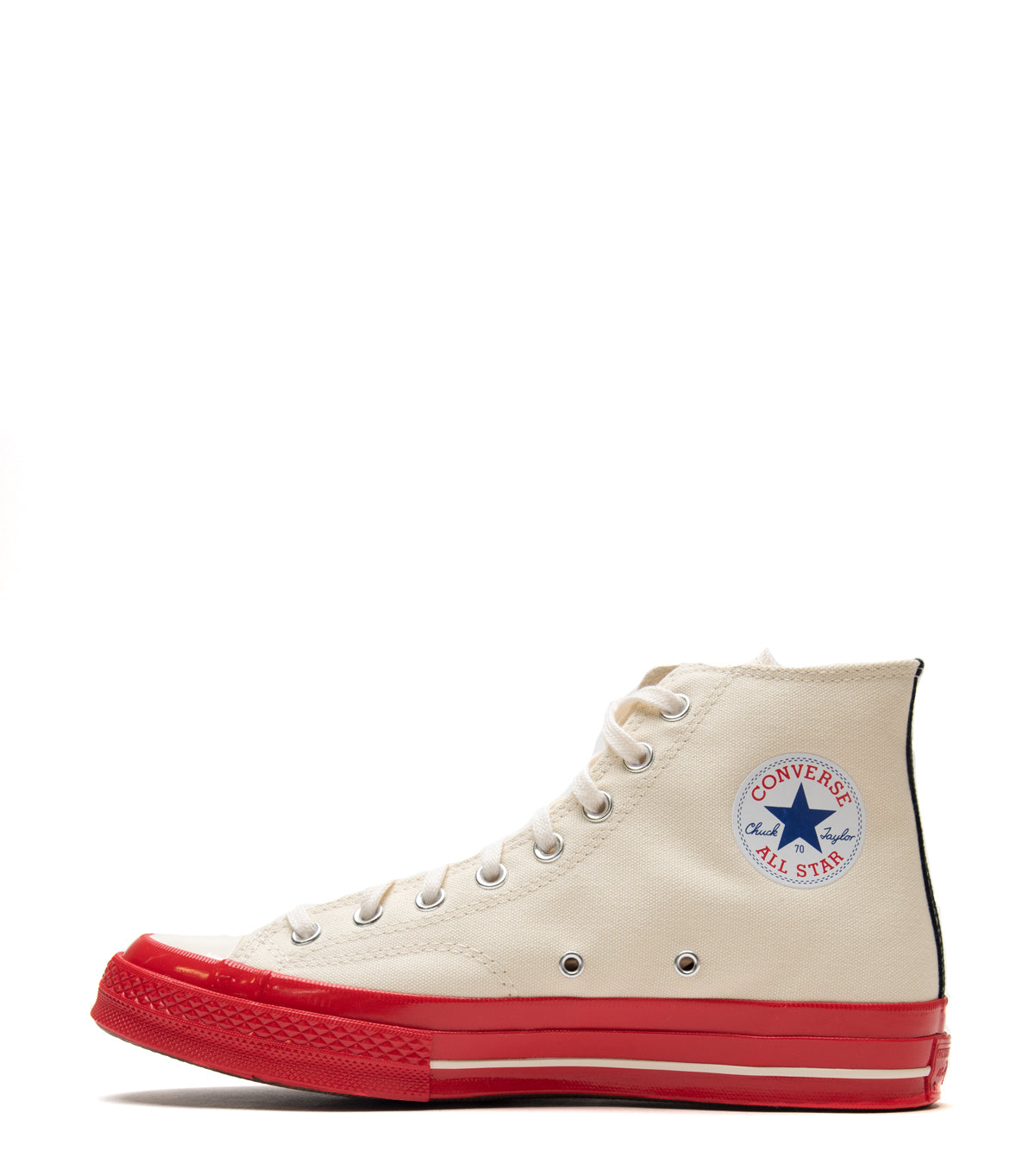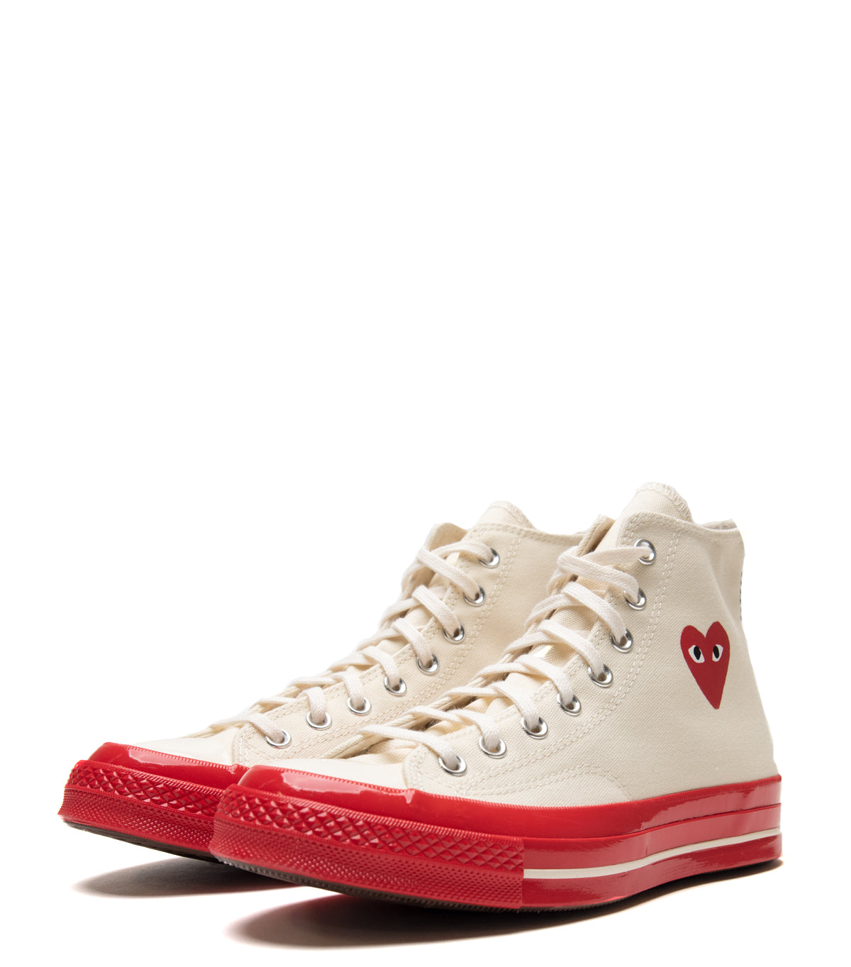 Classic Converse Chuck 70 Hi in collaboration with CdG Play. Features a cream colored canvas upper, a red rubber midsole, and finished with CdG Heart logo motifs on both sides of the shoe.