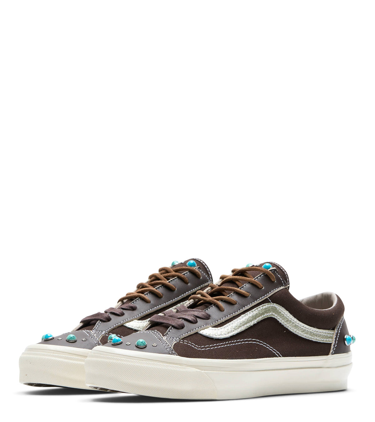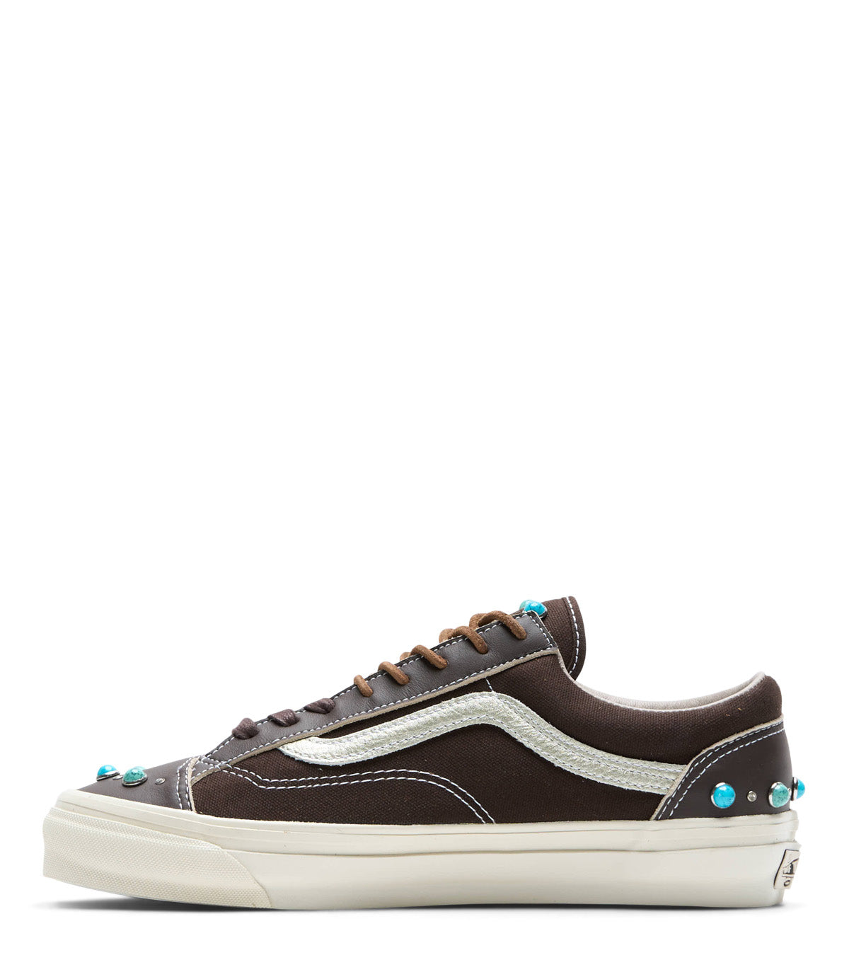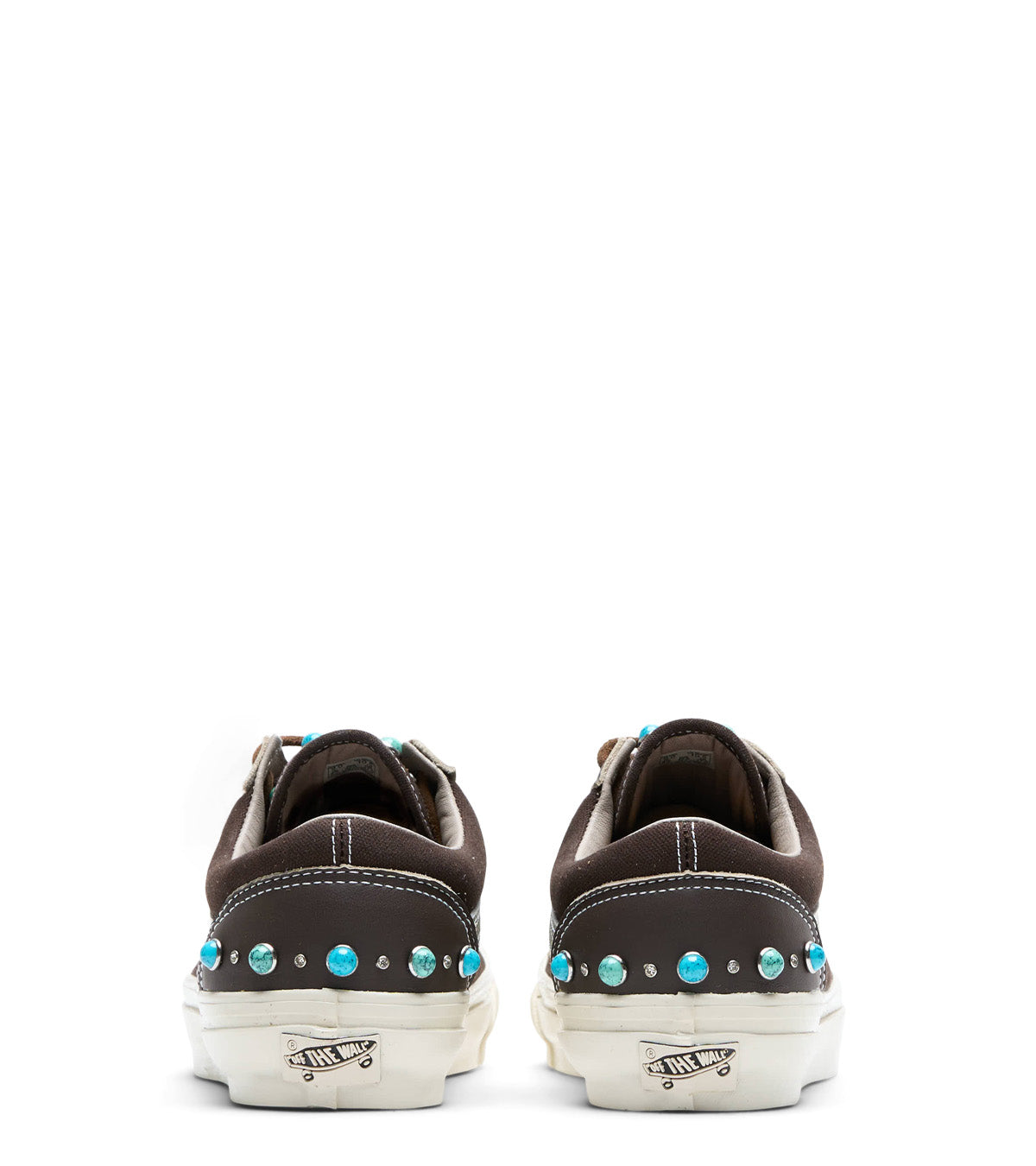 Classic Old Skool silhouette from Vans with all new lux updating. Made with a soft leather on the front and lace system inserts, soft suede on both sides of the upper, and finished with turquoise gemstone details all over the front, tongue, and on the back heel.