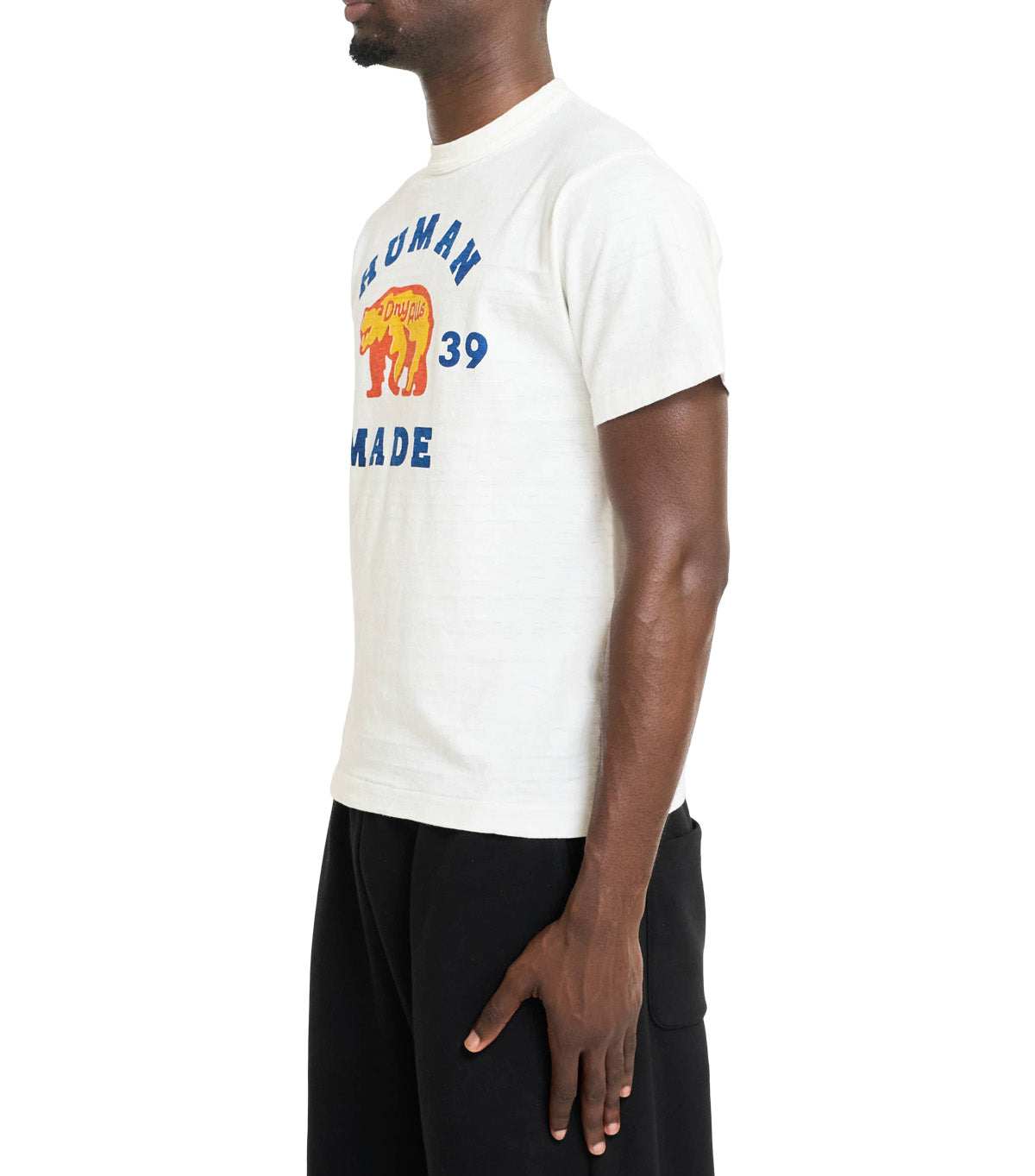 100% woven cotton short sleeve t-shirt that features an original screen printed graphic on the front. Finished with a crew neckline and a straight hem on the bottom.