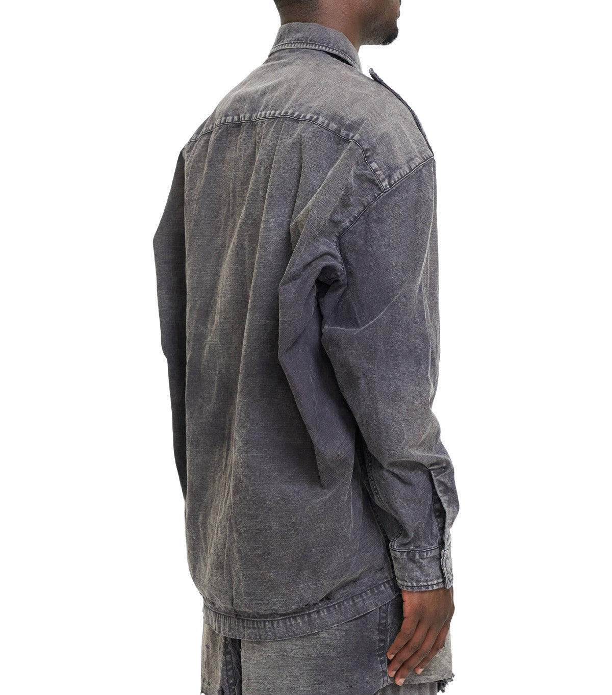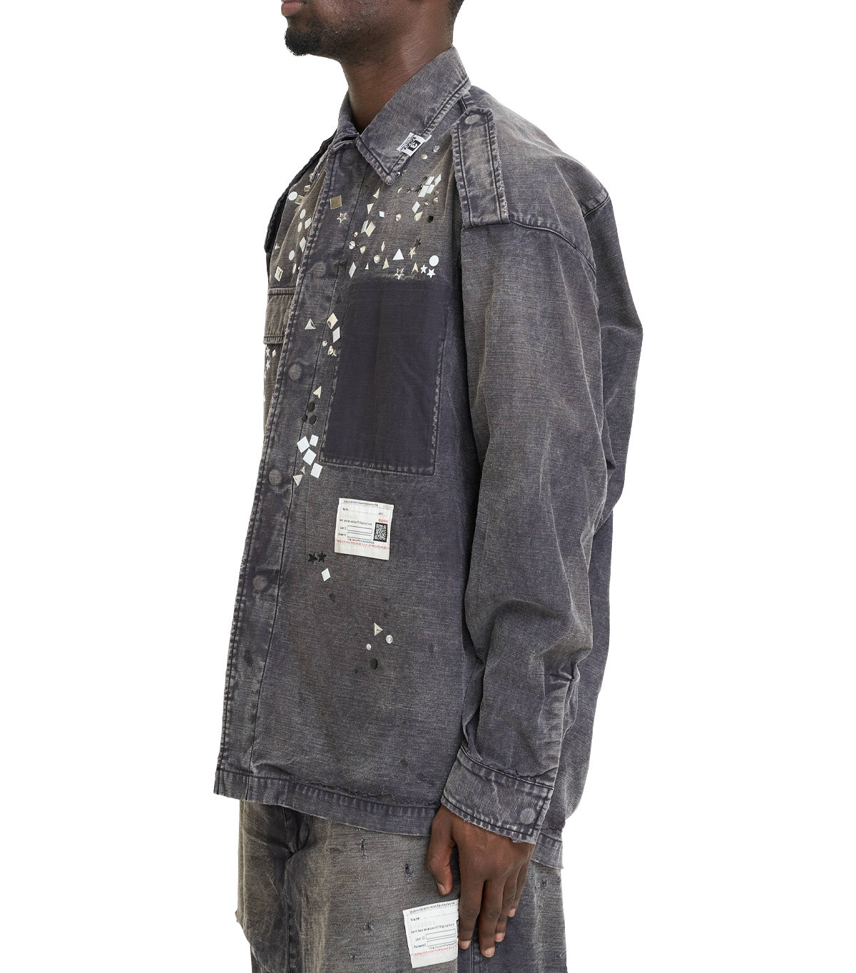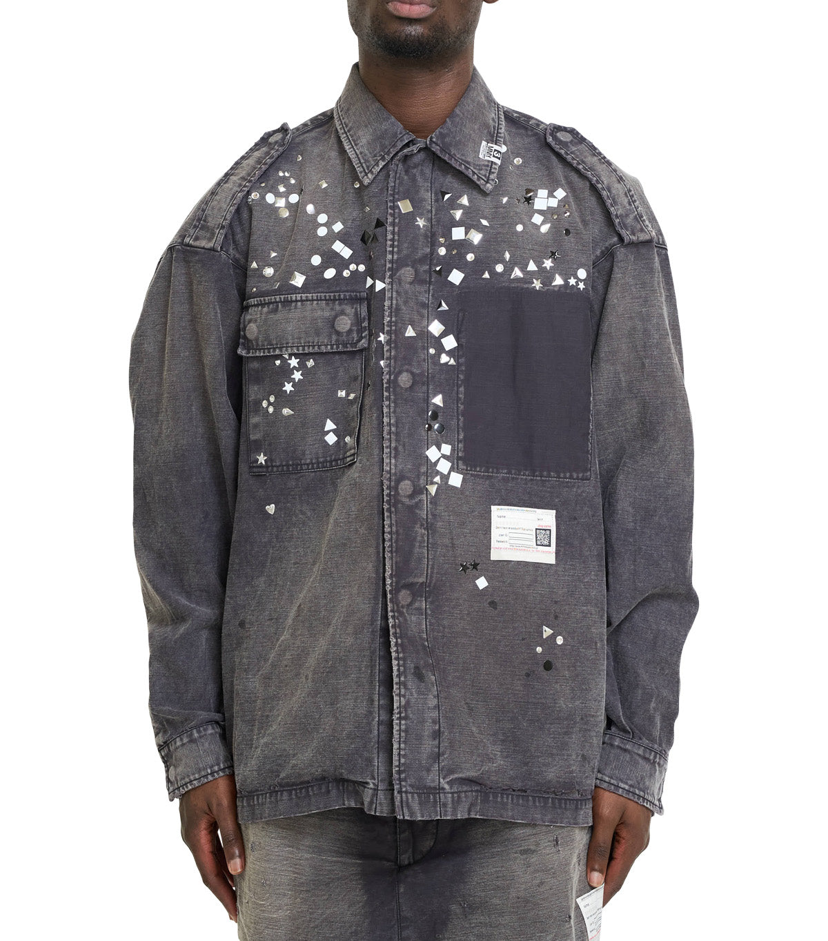 Inspired by vintage military gear, this long sleeved shirt features unique metallic embellishments all over the jacket, patchwork detailing on the front, a large front chest pocket, stitched tag on the side, and finished with a snap button closure on the front.