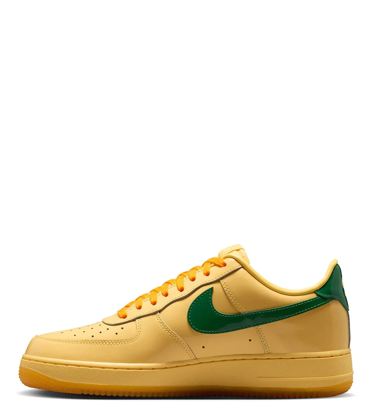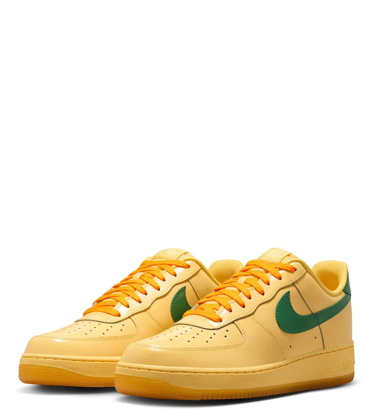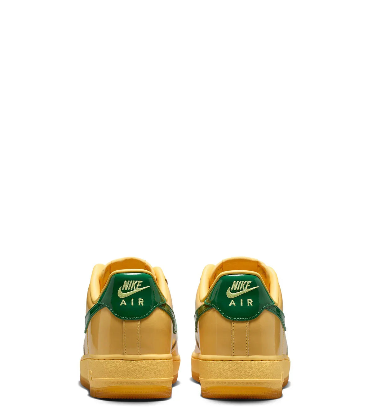 An all time classic returns in a spring ready color way. Made with a premium soft patent leather fabric all over, This pair features an all over golden yellow color wash and finished with green details on the Nike Swoosh and on the back heel.