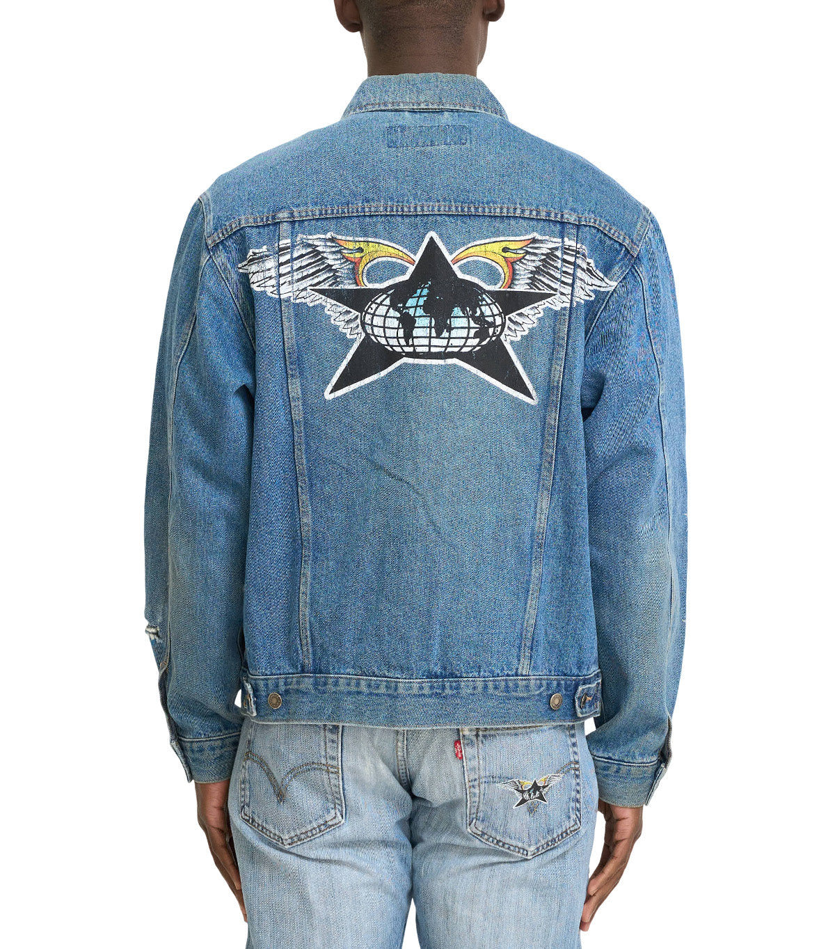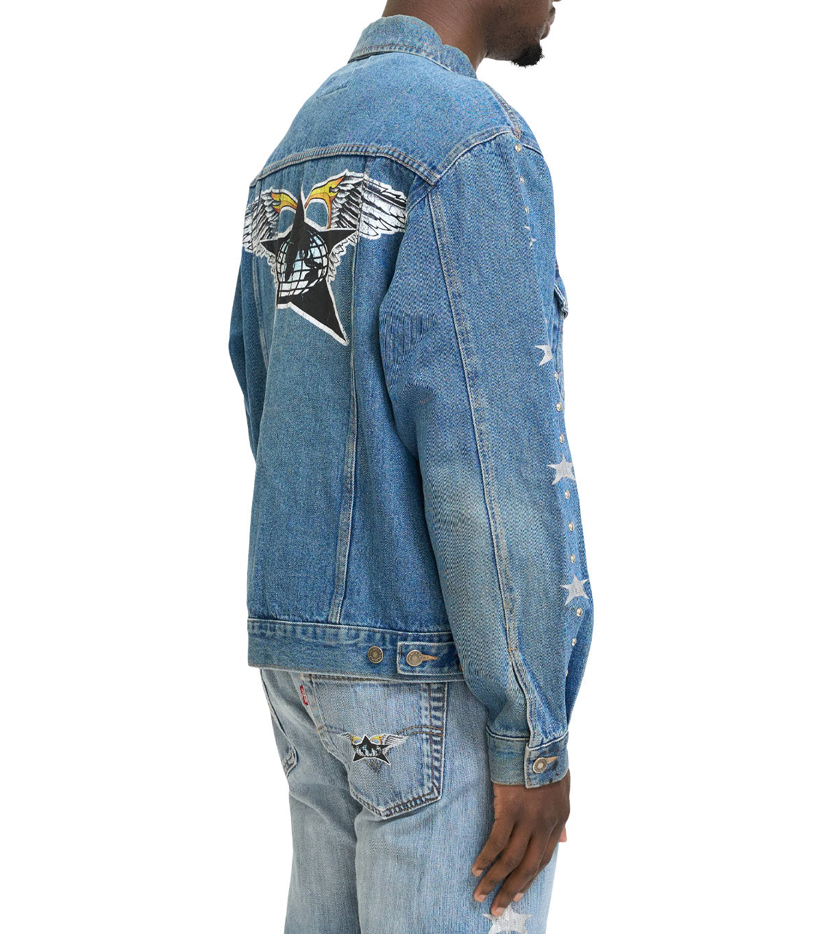Made from a vintage denim Levi's jacket, this display of art and craftsmanship feature unique studded inserts on the sides of both arms, star graphics hand printed onto the sides of both arms, and finished with hand screen printed graphics on the back of the jacket.