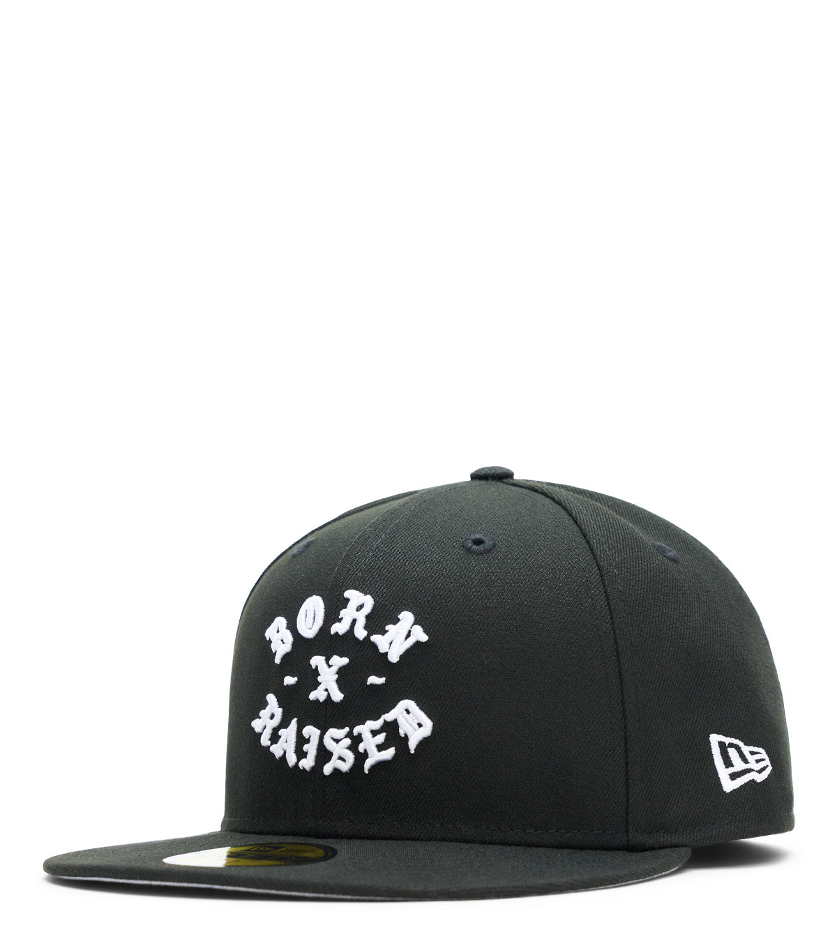 Classic New Era fitted hat adorned with embroidered Born x Raised logos and motifs on the front and back.