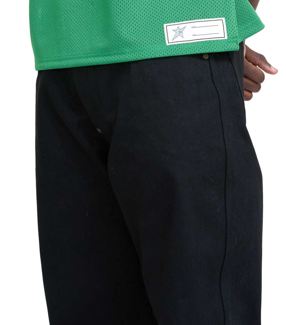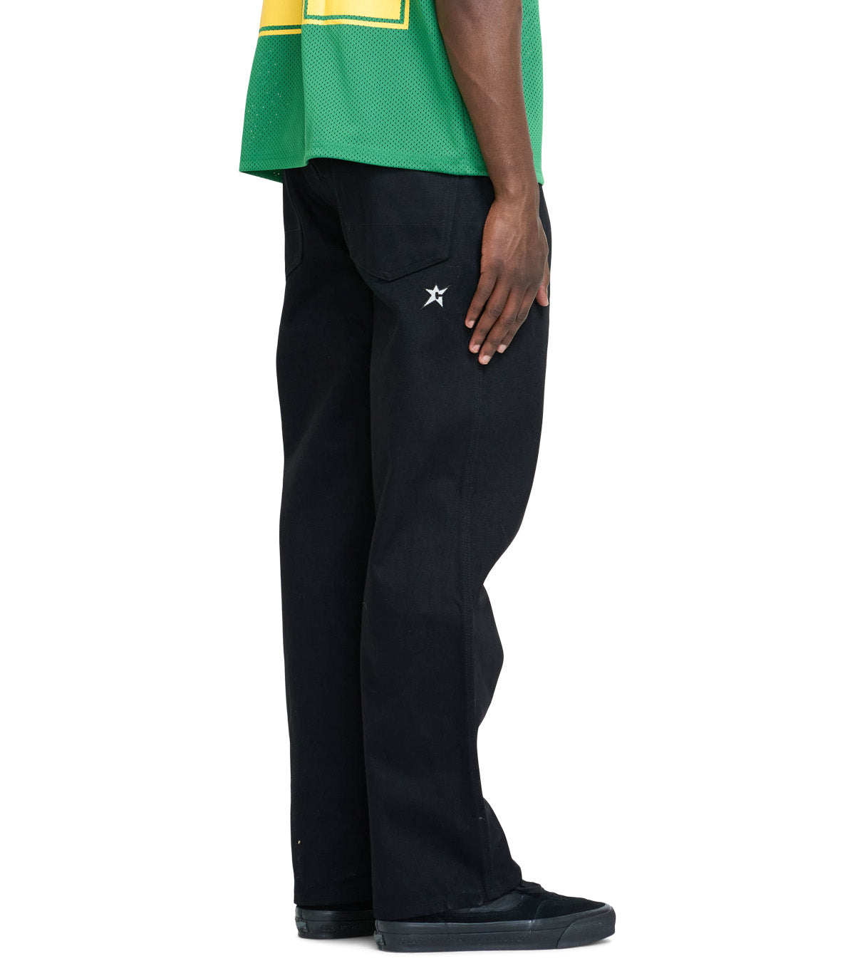 Made from a heavyweight cotton fabric, this all black pair of jeans features a baggy fit all throughout, custom rivet hardware, a small embroidered C-Star logo on the side, a red leather tab on the back, two front pockets, two back pockets, belt loops, and finished with a zipped closure.