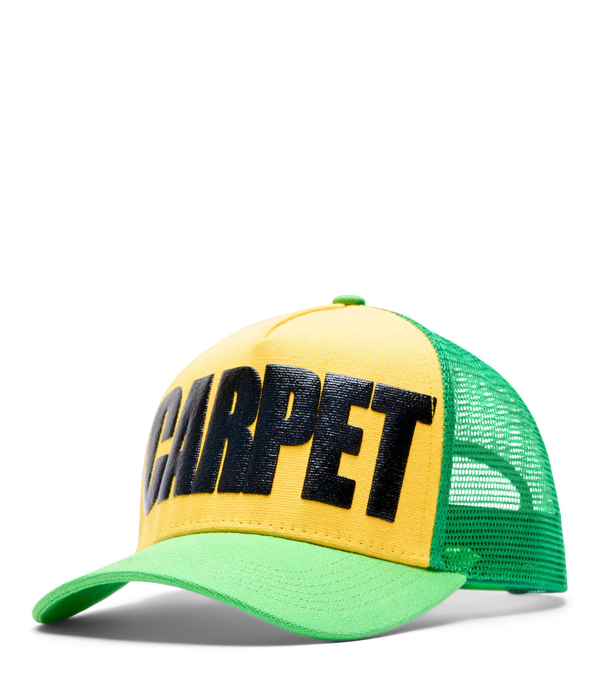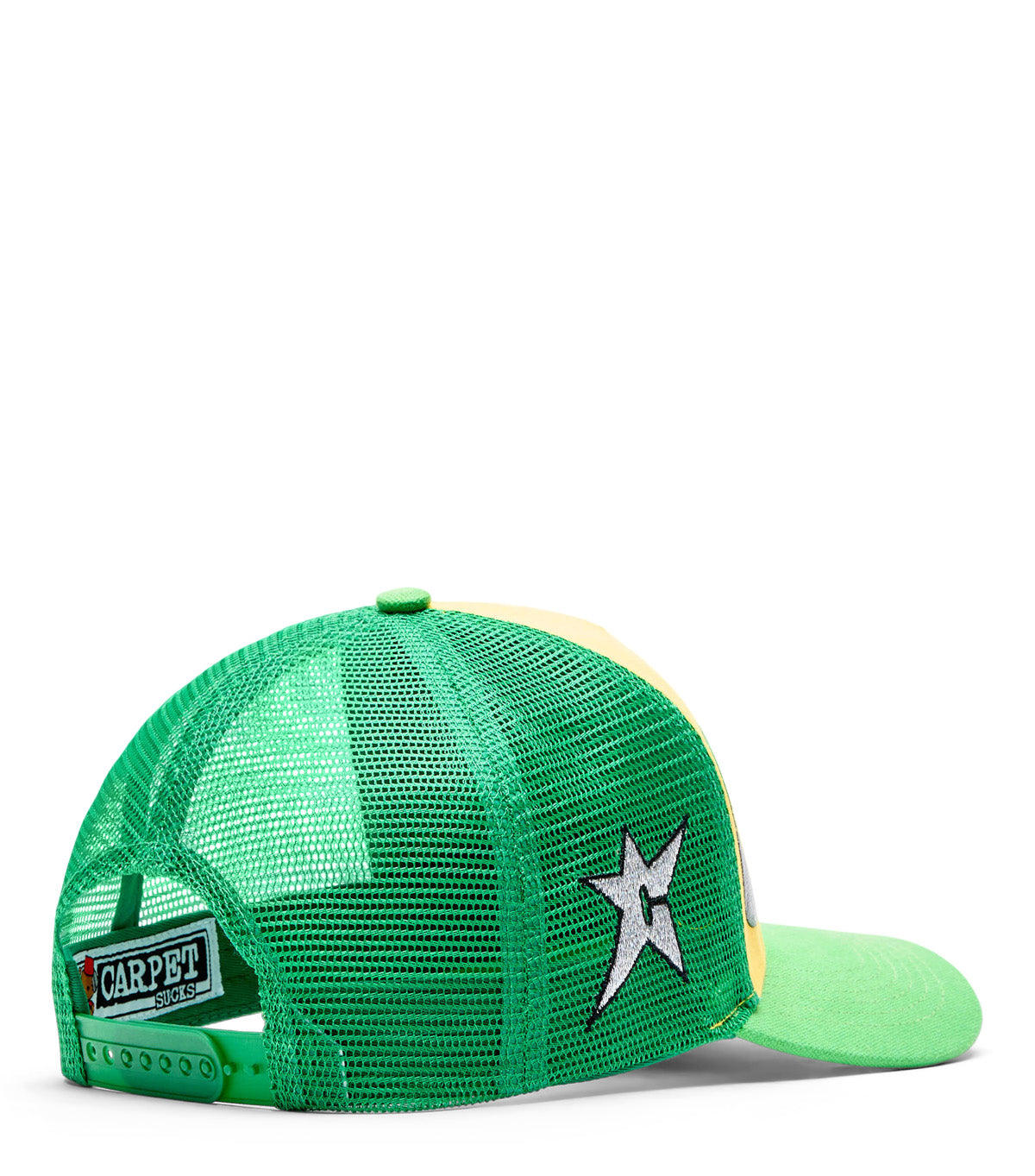Classic trucker hat silhouette, features a canvas fabric brim and front with a bold graphic printed on the front with a Carpet logo, green mesh detailing on the side, an embroidered C-Star logo on the side, and finished with an adjustable snap back.