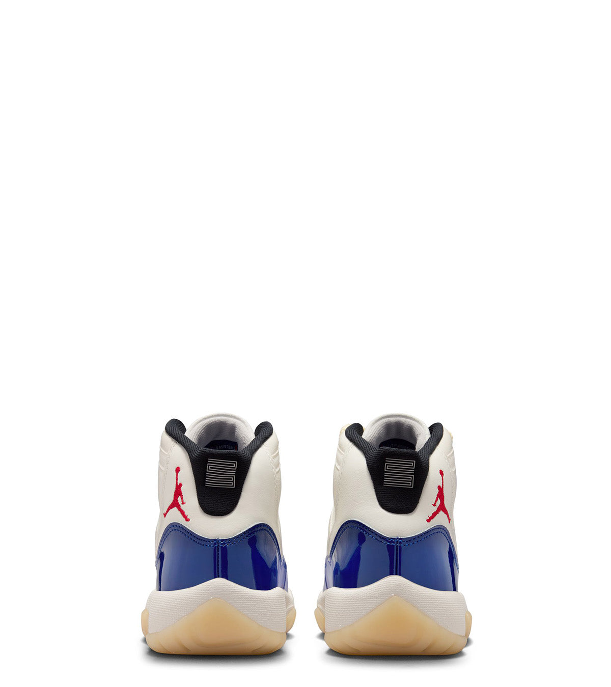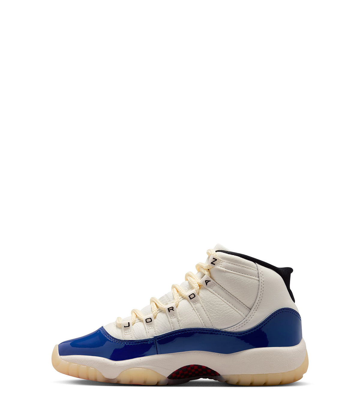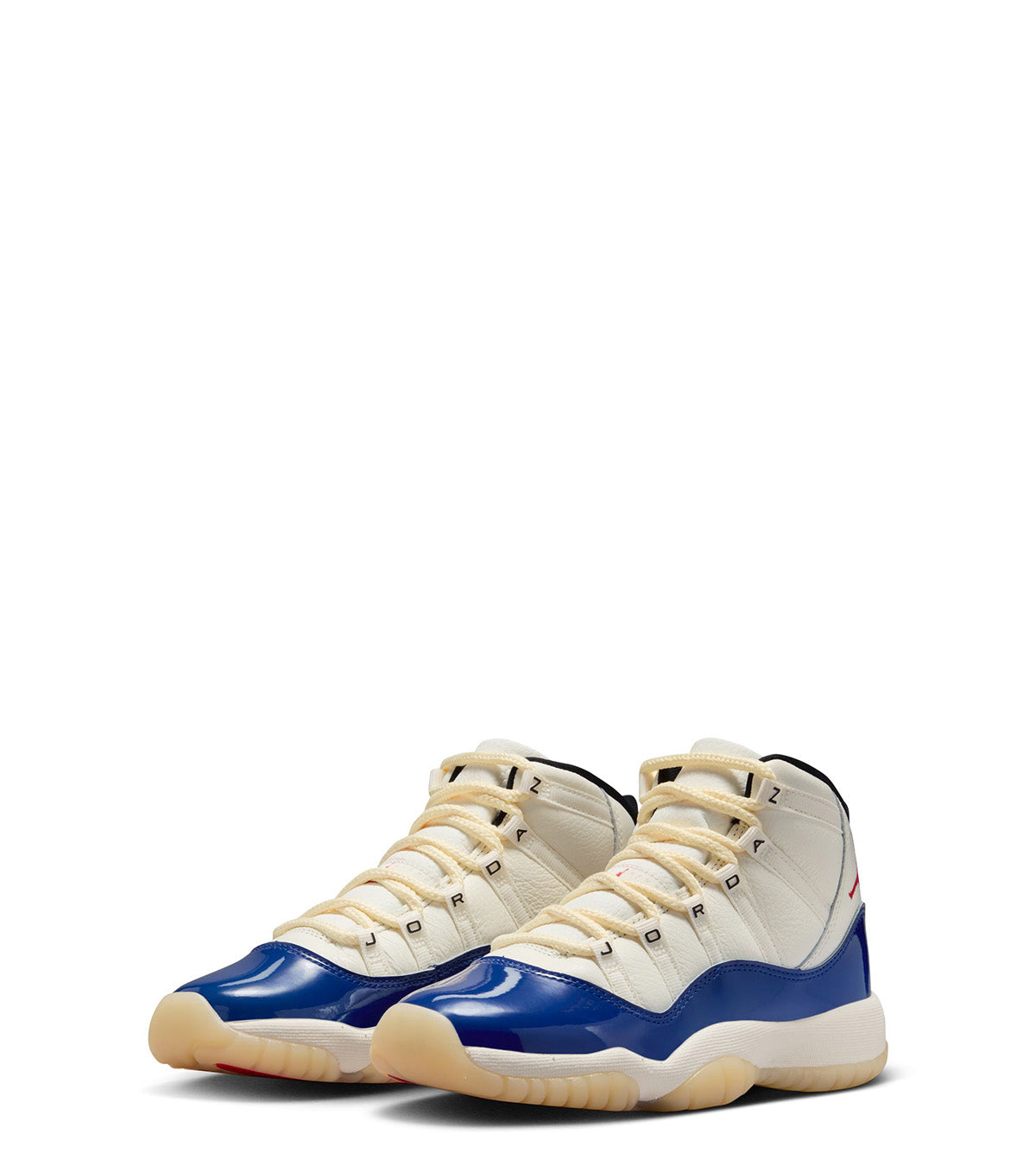 For the kids. The classic Jordan 11 silhouette gets an all new color way added to the extensive collection. A soft cream colored tumble leather constructs the upper with a royal blue patent leather mid stripe compliments the upper layer. Finished with a red Jumpman logo on both heels and a cream colored translucent outsole.
