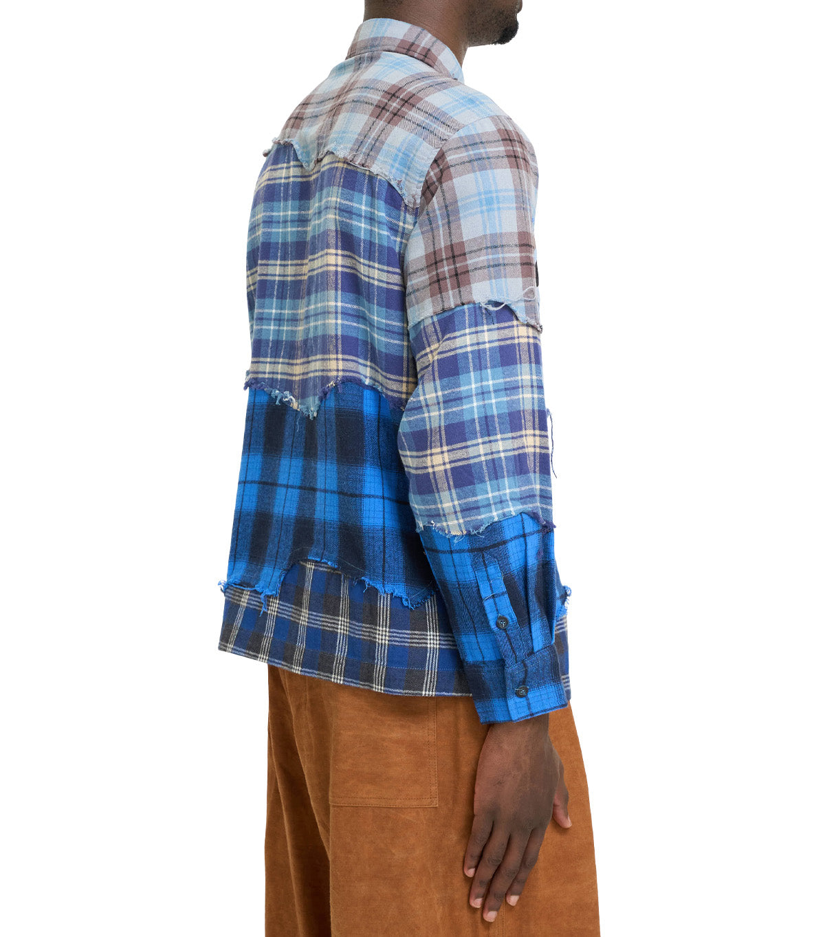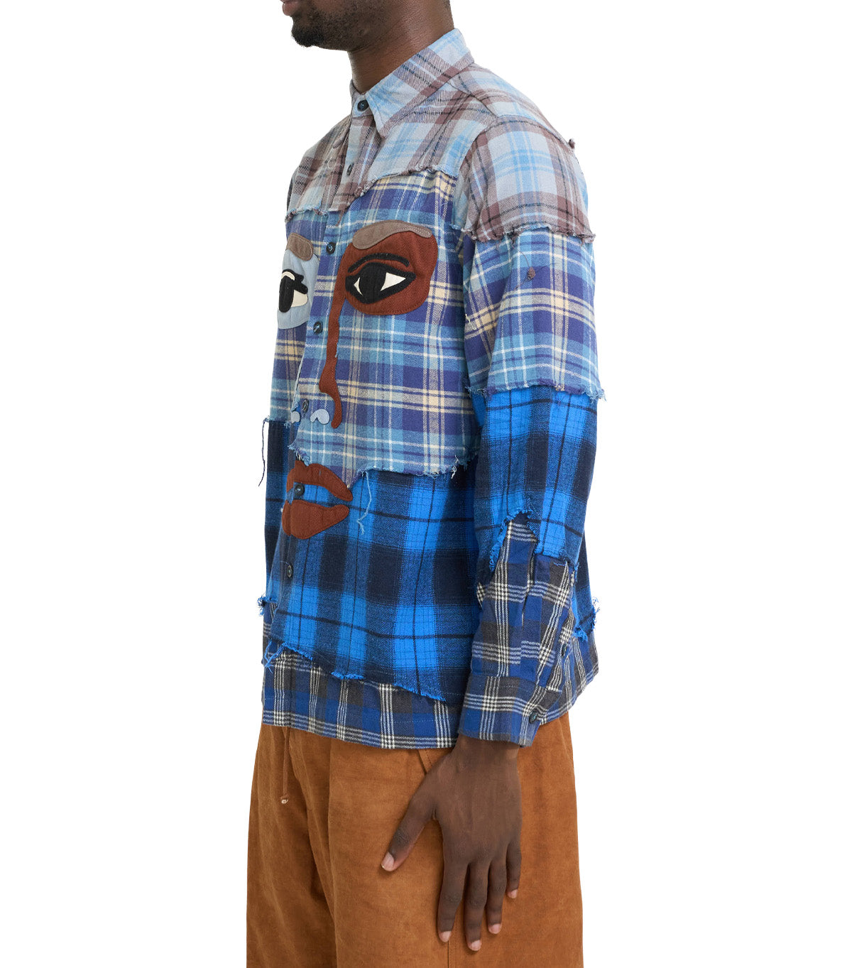 This unique flannel button up shirt is made from a multitude of flannel fabrics and features a patchwork face graphic on the front made with a multitude of fabrics. Finished with a collar, buttoned finishes on the cuff, and a straight hem.