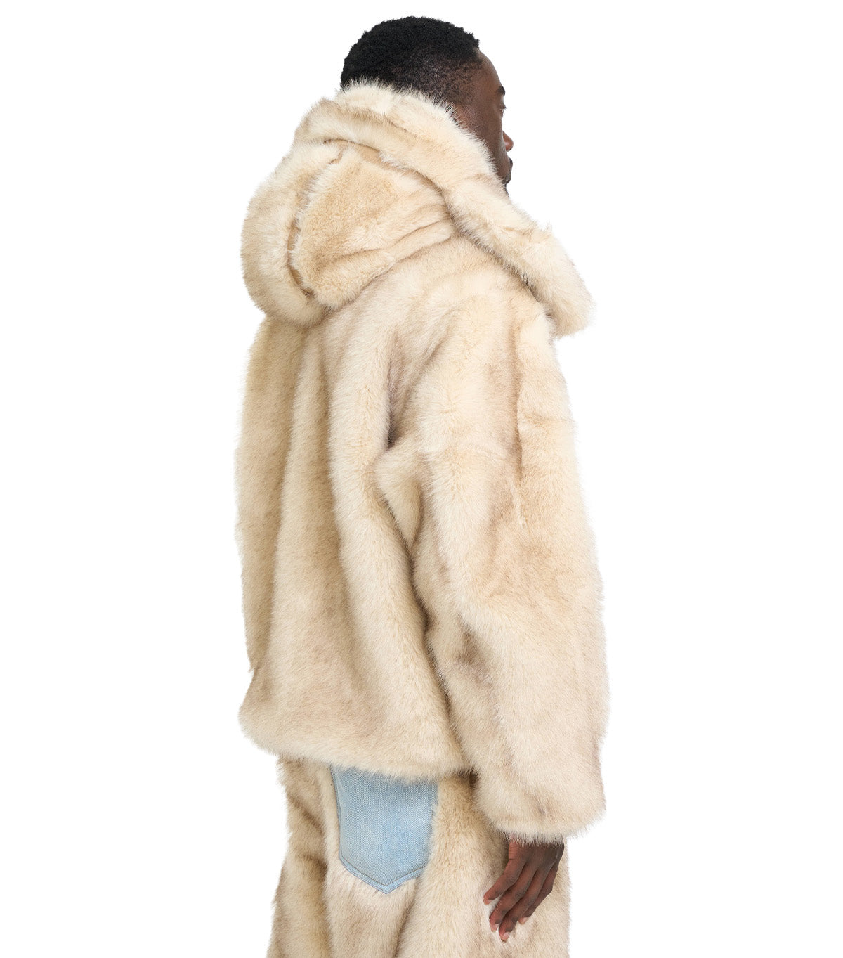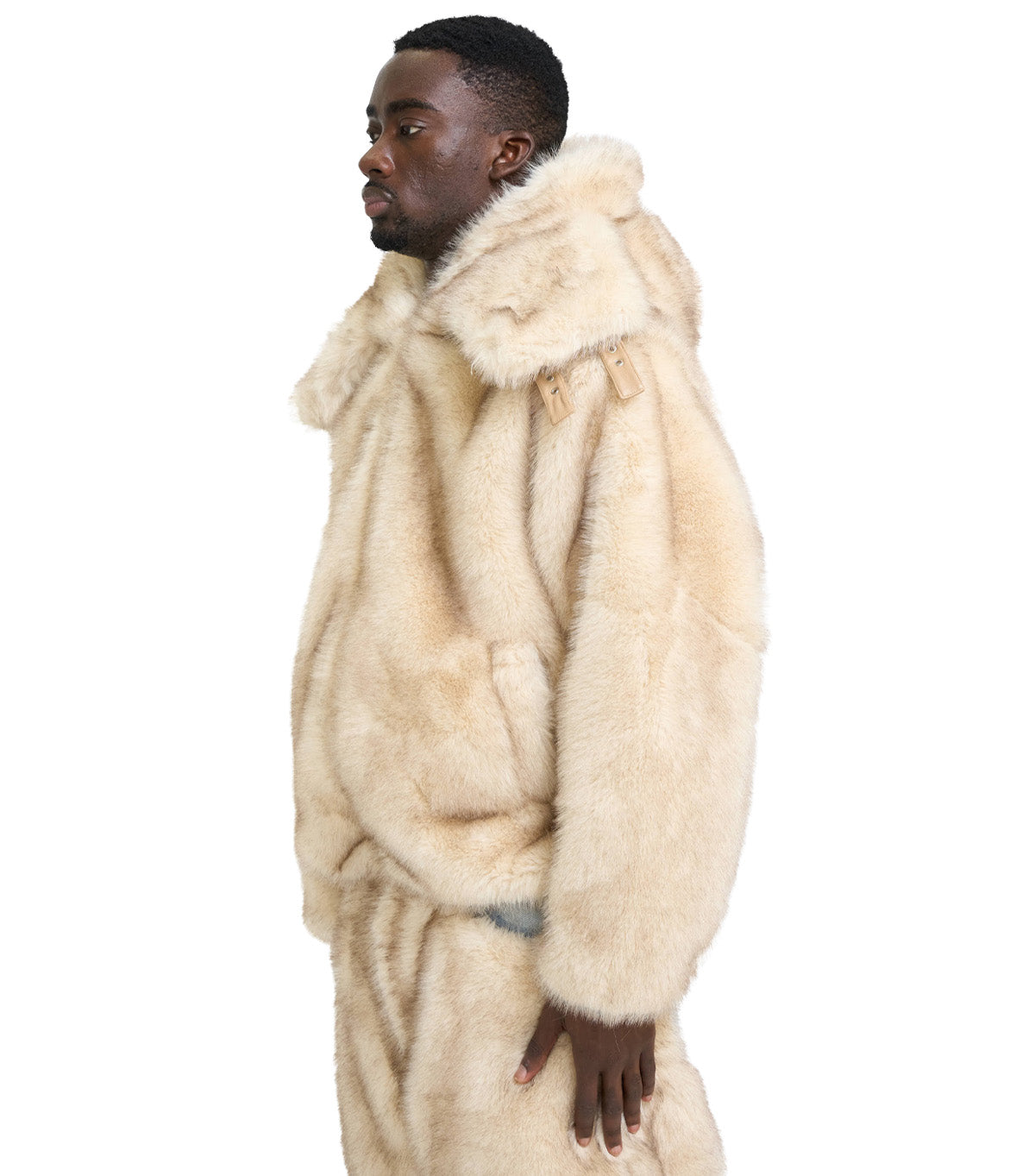 An intricately designed piece made entirely from a soft faux fur fabric on the interior and exterior. Features a soft leather clasp around the face area and hooded compartment to keep you warm. Finished with two front pockets on the sides and a zip closure on the front.