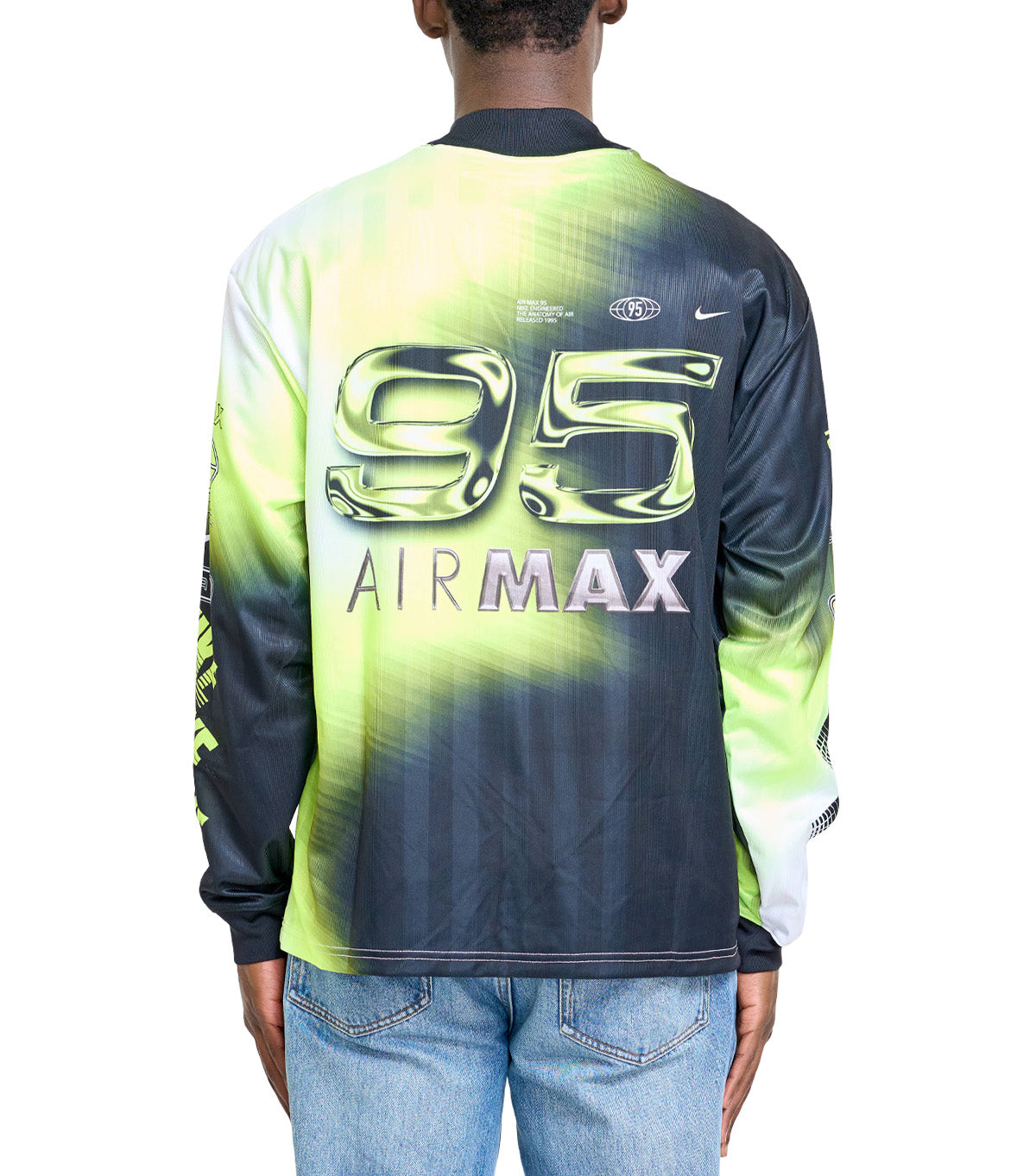 An intricately designed jersey made from a soft polyester fabric. Features an all over green and black print that features a multitude of Air Max branding and 95 branding.