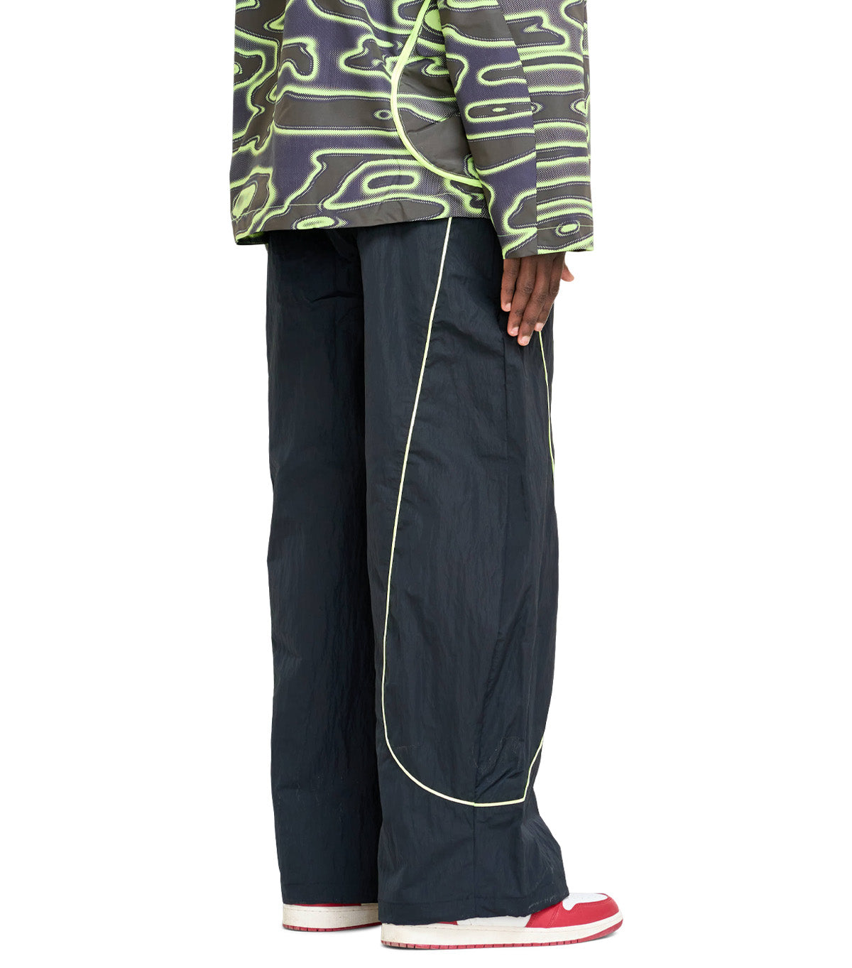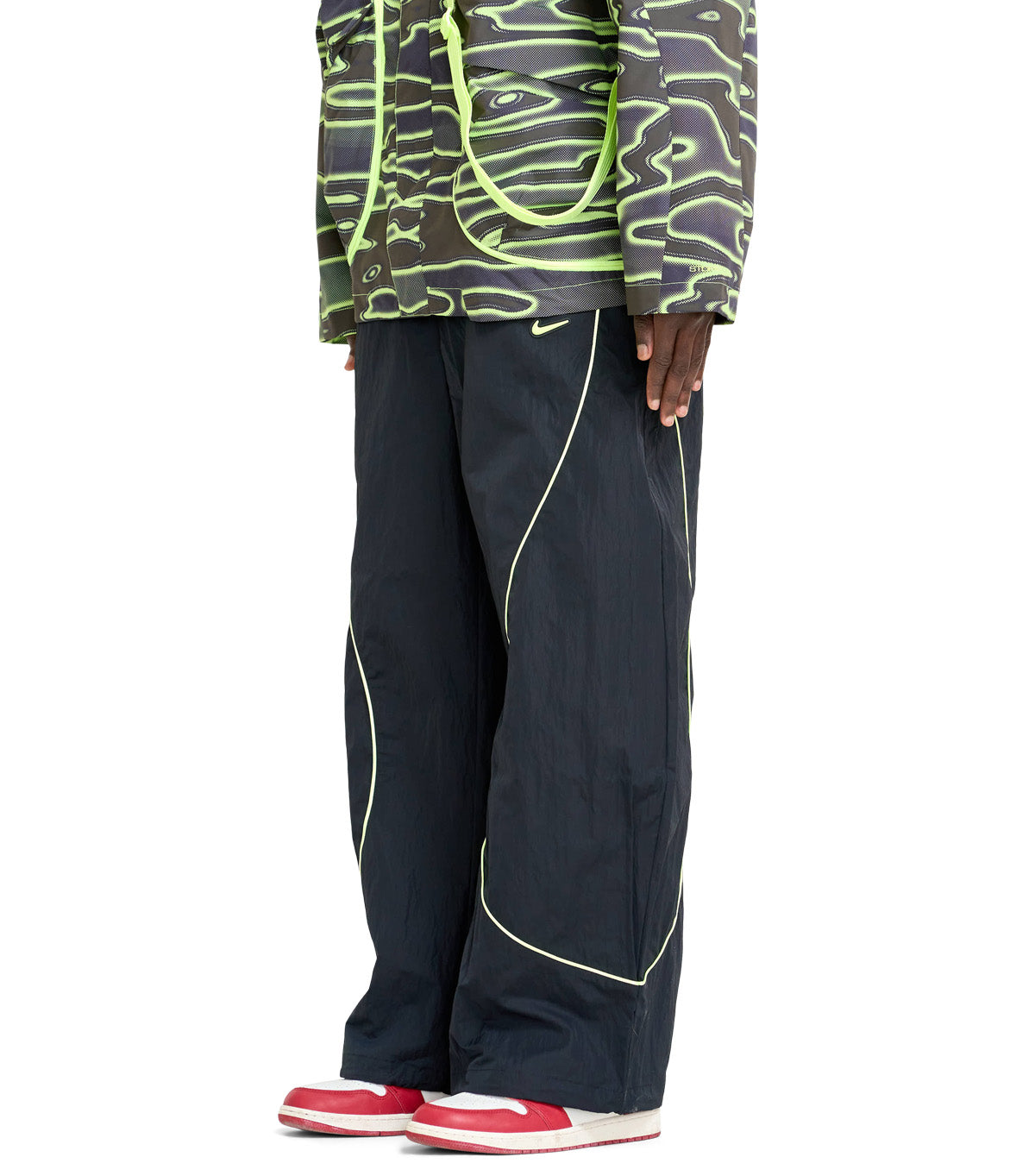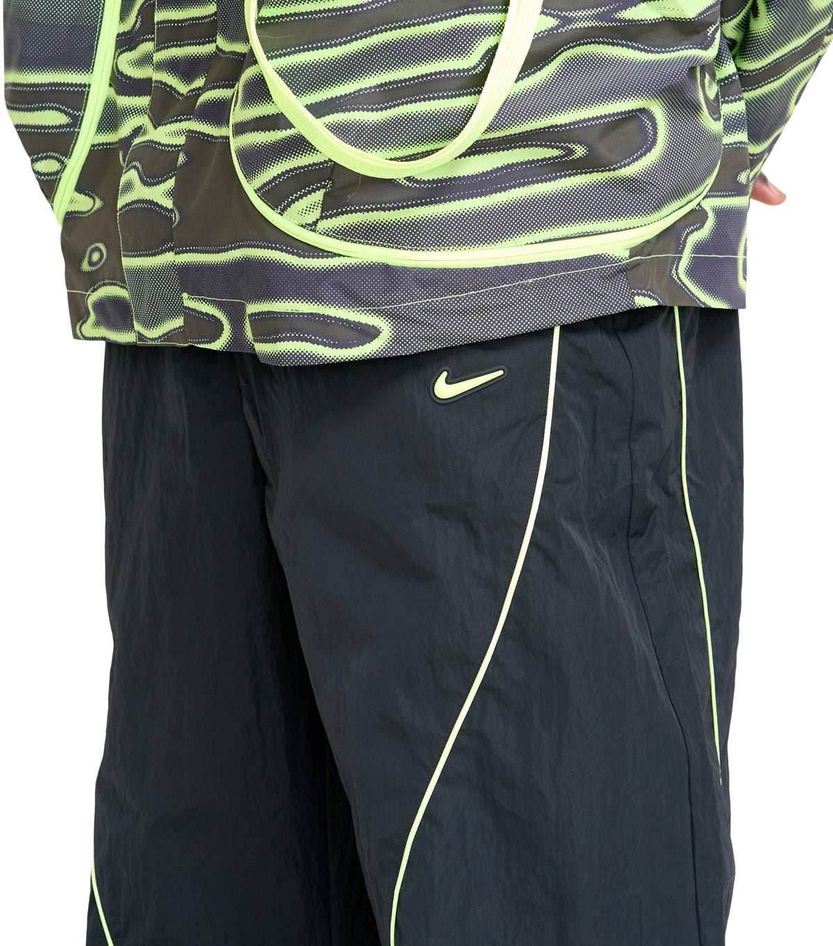 Wide legged pants made from a soft polyester fabric, finished with neon colored piping details going through the front and back of the pockets, a small Nike check detail on the front, and finished with 2 front pockets.