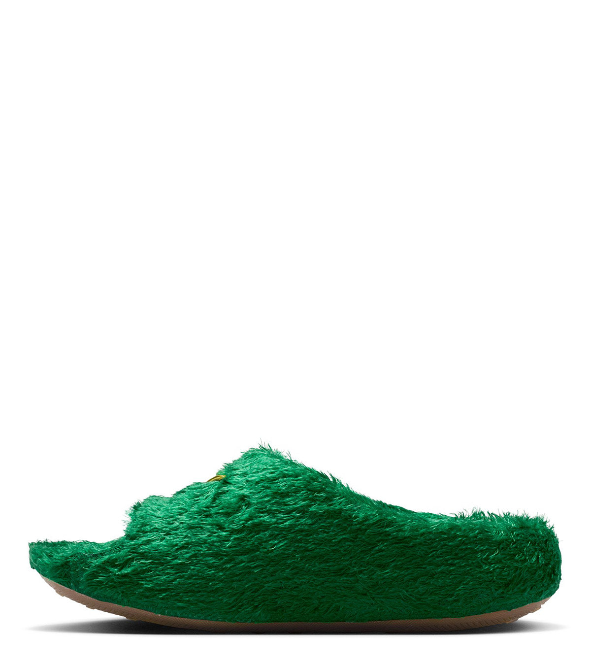 Apart of .SWOOSH 'Touch Grass' collection. This silhouette is inspired by the phrase commonly used by gamers who need to 'touch grass' with an all over grass overlay on the molded rubber upper, a soft fur lining bed on the inside for the utmost comfort walking, and finished with a gum sole ridged outsole.
