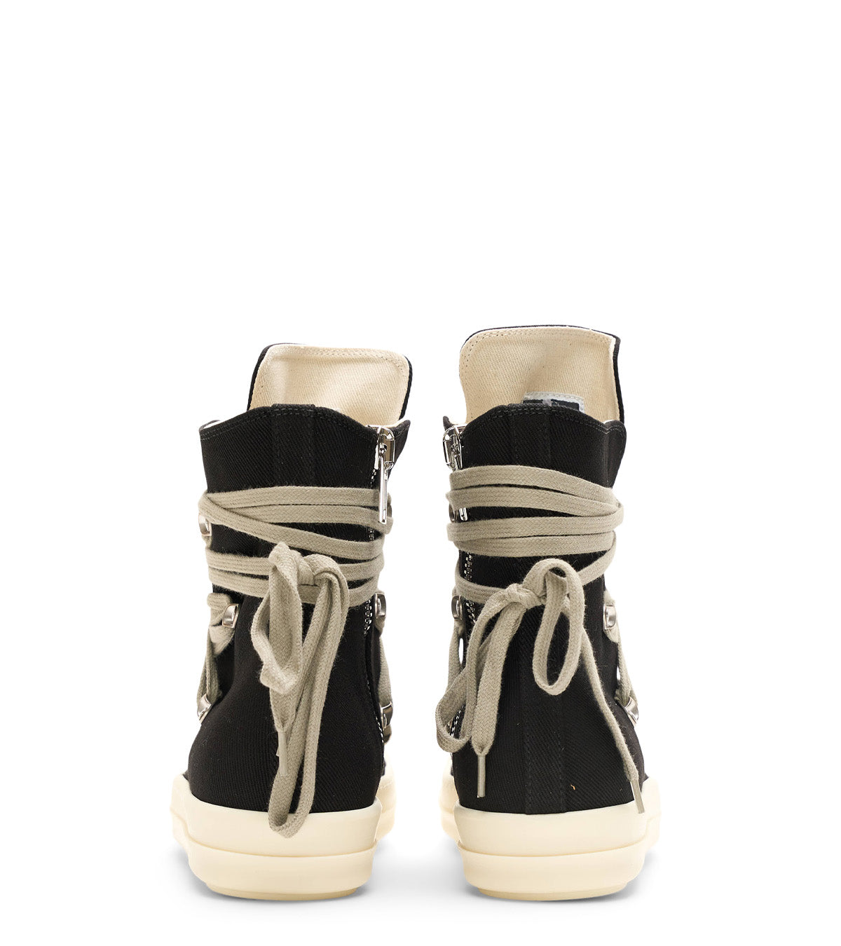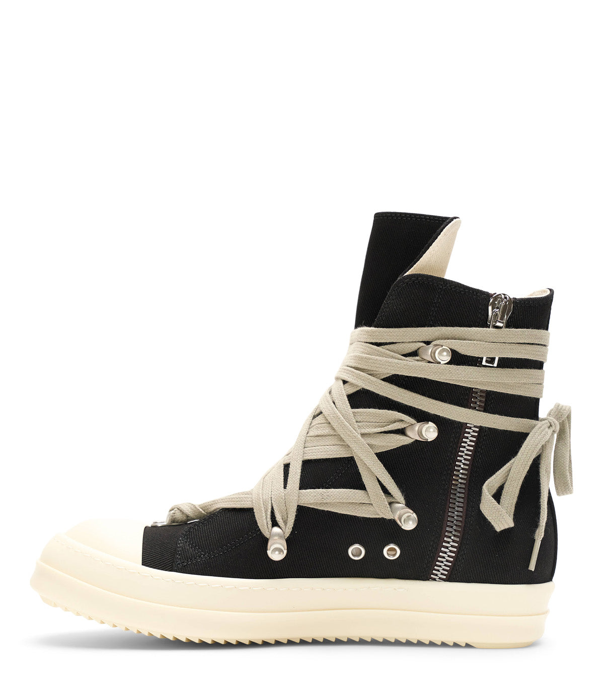 One of the most popular silhouettes from the DRKSHDW footwear family. Made with a full length canvas fabric on the upper, a soft rubber midsole with a rubber toe guard on the front, a ridged outsole on the bottom, a metallic zipper on the side for easy access, and finished with a unique pentagram lace system all around the upper.
