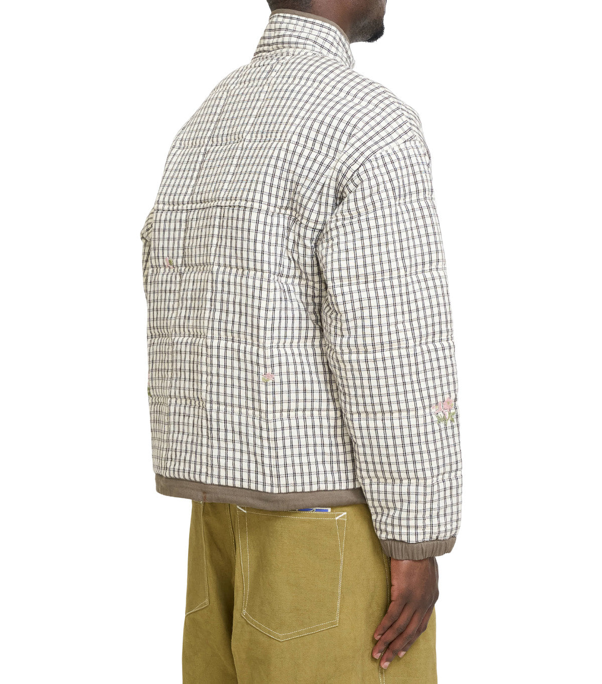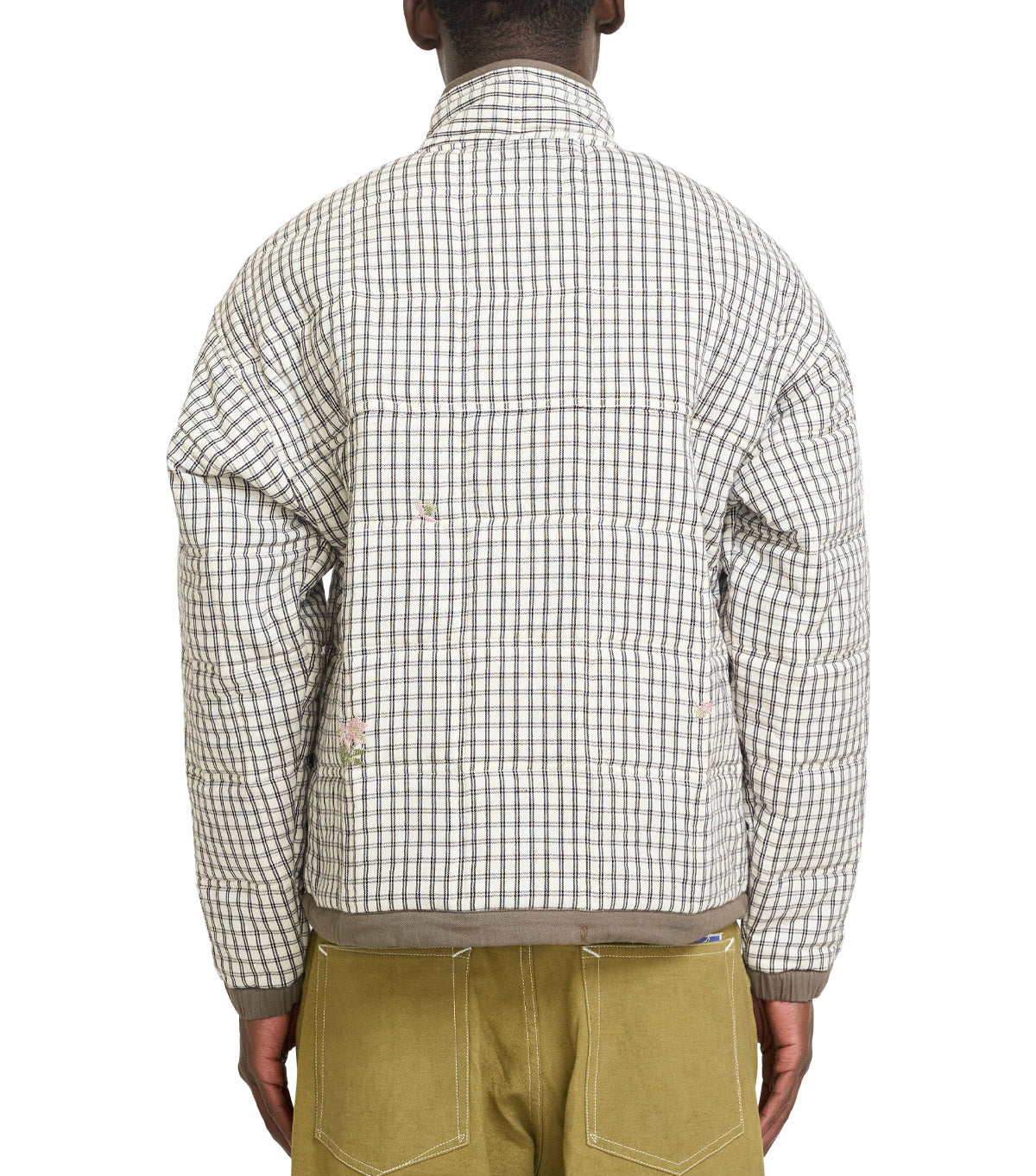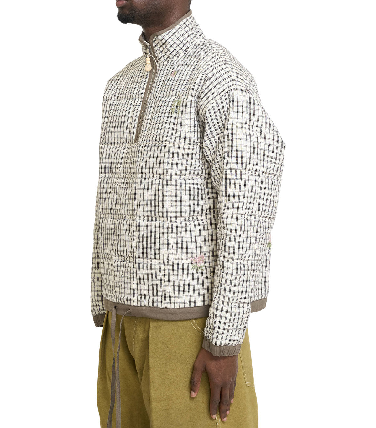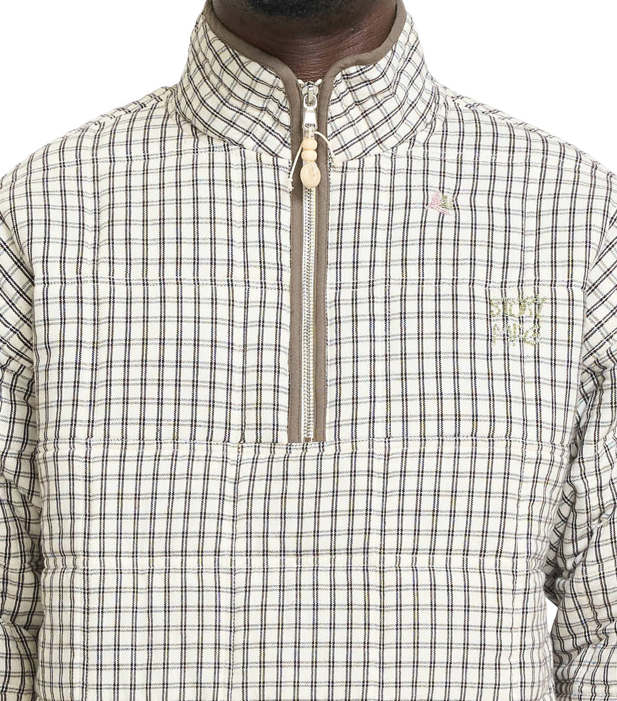 Made from a 100% cotton fabric that has been hand woven into a checkered design, this intricately detailed quarter zip sweatshirt features a quilted layer for the utmost comfort and warmth, contrast trim on the bottom hem and arms, an adjustable drawstring on the waist for desired fit, and finished with a corozo nut zip pull on the top.